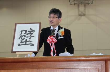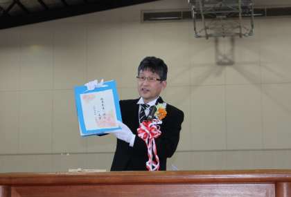 校長式辞。今日は、モーニング姿ですが、お話をするときには、必ずといっていいほど、話に関係する「何か」を手にしています。