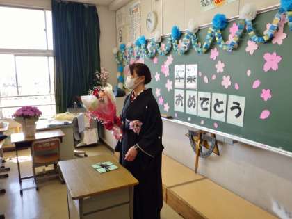 学活の時間の最後に、担任の先生に感謝とサプライズの花束を手渡しました。