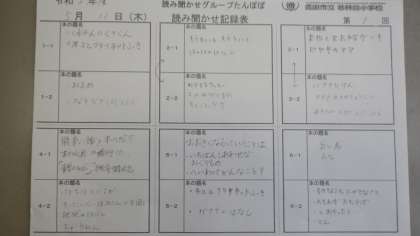 読み聞かせボランティア「たんぽぽ」の皆さんが、各クラスで今年度第1回目の読み聞かせをしてくださいました。読み聞かせの話術と本の世界に引き込まれ、乗り出すように見入る子どももいました。「999ひきのきょうだい」では、1匹だけいつまでも卵の中で寝ていたおたまじゃくしが、お母さんに「いい加減にしなさい」と怒られたシーンでは、「やっぱりね」とつぶやいたり、国語で学習した物語を思い出し、「すいせんのラッパに出てくるかえるかな」と言ったりしながら、想像の世界を広げていました。