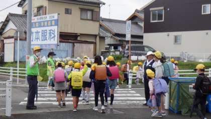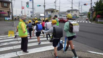 通学班の班長は腕時計を持っているので、時間になると出発します。横断歩道などの危険な場所には、保護者や地域の方が立ってくださり、中には、集合場所から一緒に付き添ってくださる方もいて、本当にありがたいです。班長は時々後ろを振り返って様子を見たり、途中で立ち止まって給水タイムを設けたりします。上級生は下級生を道路の内側にするよう気を配り、場所によって立ち位置を変える振る舞いはとても自然です。子どもたちは、会話を楽しんだり、時にはもめごとを起こしたりします。