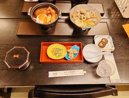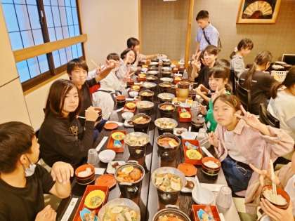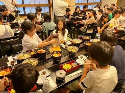修学旅行1日目の夕食から 公開日 2023/10/06 更新日 2023/10/06 お知らせ 今日はたくさん歩いて、たくさん見学をしました。おなかもすいたことでしょう。夕食は午後5時30分からでしたが、きっとたくさん食べられたのではないでしょうか。
