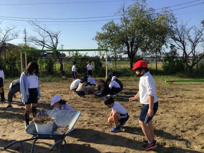 あるクラスが、自分たちにできることをしようと、登校後、草が残っている運動場の草取りを始めました。学習用タブレットを毎日持ち帰るようになったので、朝連絡帳を書く必要がなくなり、時間が生まれたのです。草取りの輪が広がり、他クラスや他学年も草取りをする子が増えました。草に覆われていた運動場は、草が目立たなくなってきました。