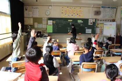 (写真1 1年2組研究授業「昔遊び名人になろう!)
