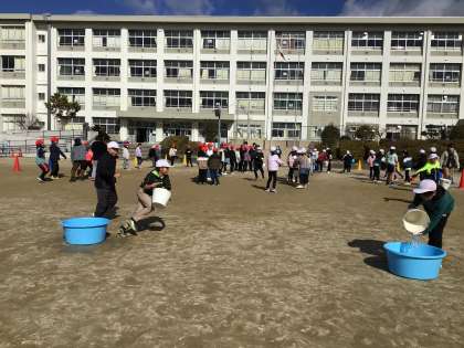 4年生が、防災教室を行いました。まず、豊田市役所防災対策課の方から、能登地震に支援に行った経験を踏まえた防災の話を聞きました。その後、班に分かれてクロスロードゲームを行いました。「先生がいない自習時間に地震が起きたら、先生を待つか自分で避難するか」という問題では「いつも避難訓練をしているから、自分たちで避難できる」という意見が出ました。それぞれが理由を付けて意見を述べたり、違う視点の意見にも肯定的に受け止めたりする子どもたちの姿に、防災対策課やPTAОBの方々が感心してみえました。最後に、PTAОBによる伝言バケツリレーを行いました。大切な伝言を伝えながら、協力してバケツリレーをする大切さを学びました。保護者の方にもお手伝いいただき、充実した体験となりました。関係の皆様、ありがとうございました。
