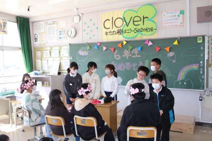ファミリー遊びでは、5年生が考えた遊びをみんなで楽しんだ後、メッセージカードや鉢植えの贈呈、6年生から5年生へのファイルの引継ぎもありました。いよいよ6年生から5年生にバトンが引き継がれていきます。