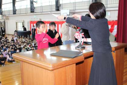 修了式がありました。最初に5年生が静かに入場してくれたおかげで、1年を締めくくるのにふさわしい緊張感のある式となりました。スピーチでは、1年生の代表が、ファミリー掃除で掃除の仕方が身に付いたと話しました。5年生の代表は、自分で考えて行動する力が身に付いたと述べました。どちらも立派なスピーチでした。