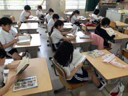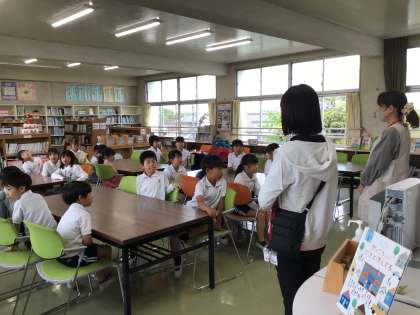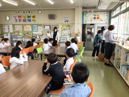 図書室で、図書利用ガイダンスがありました。2年生は、新しく赴任した学校司書さんのあいさつを聞いた後、図書室の使い方を学びました。その後、思い思いに好きなコーナーに行き、一人2冊本を借りました。「大阪城の本はありますか」とさっそく学校司書さんに聞いたり、「この本おもしろいよ」と怖い物語の本を見せてくれたりして、とても楽しそうです。ちょうど図書室の飾りつけボランティア「わたげ」さんも、活動していました。教室では、夢中になって本を読む姿がありました。