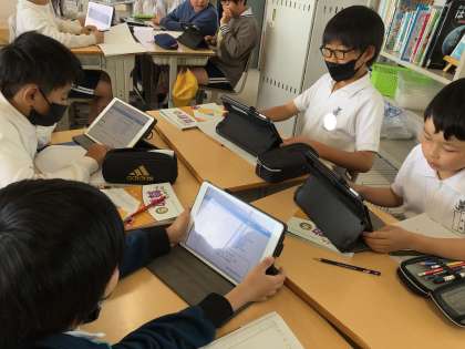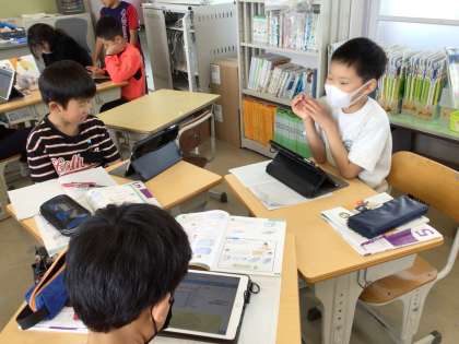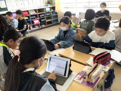 5年生が、算数で容積を求める学習をしていました。ガラスに厚みのある水槽の計算式を、それぞれが学習用タブレットに書き込みました。その後、書き込んだ式をタブレットで見ながら、グループで説明し合っていました。