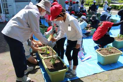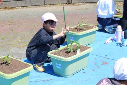 2年生野菜苗植え 公開日 2024/05/10 更新日 2024/05/10 お知らせ 本日、1、2時間目を使って、2年生がトマト、ピーマン、オクラの野菜の苗植えを行いました。プランターに土を入れ、苗を植えて、水をあげる。講師の先生のお話をよく聞いて、「大きくなあれ」と話しかけながら植えているほほえましい姿がありました。お手伝いに来てくださったお母さん方、本当に助かりました。ありがとうございました。収穫して食べるのが楽しみです。2年生のみなさん、しっかりお世話をしてくださいね。
