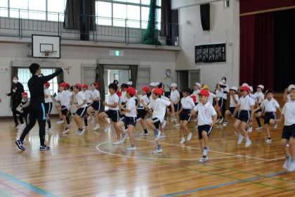 3年生が、東京オリンピック出場選手の川端魁人(かわばたかいと)選手から、走り方を教えてもらいました。姿勢やももの高さなど5つのポイントを、実践を交えながら教えてもらい、子どもたちは「速くなったような気がする」と感想を言っていました。
