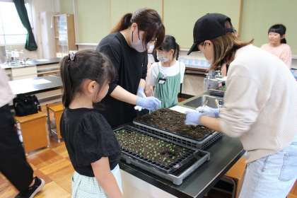 5月28日雨天の中、PTA園芸委員・環境委員の方のお力を借りて、発芽した芽を育苗箱から、黒いポットに移植する作業を行っていただきました。割りばしで、根を切らないように、優しくもちあげ、ポットに移植します。しっかり根付くように周りを押し固めます。今後は、苗をもう少し大きく育て、メイン花壇に定植します。真剣な作業を今後移植を授業で行う3年生も興味津々で見学し、学ぶことができました。ありがとうございました。
