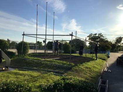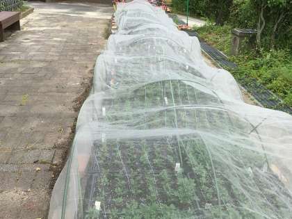 秋花壇用の苗は、PTAのみなさんのお力を借りて、少しずつ大きくなっています。子どもたちの秋花壇設計図コンクールが終わり、昨日は、PTAОB会の方が秋花壇に支柱を立ててくださいました。今日は、校務主任と公務手さんが、デザインに沿って波板を付けていました。来週は、定植を行います。