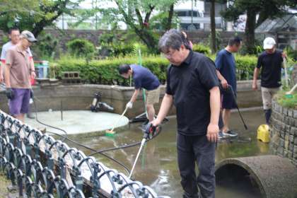池の水が抜けると、デッキブラシで汚れをこすり取りました。また、ОB会の方が持ってきてくださった高圧洗浄機で池の底や壁をきれいにすると、噴水の白いタイルも見えてきました。3時間ほどかけて掃除し、池はすっかりきれいになりました。