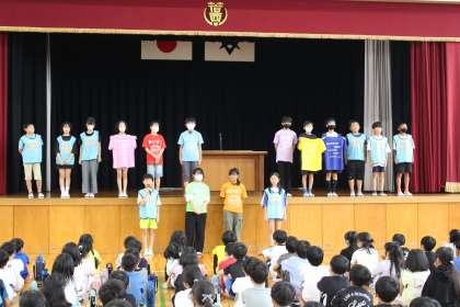 計画・生活委員の子ども達が、集会で全校児童に話をした翌朝から、ユニフォームを着てあいさつをしています。ハイタッチしながら元気にあいさつし、通学班登校する子どもたちを迎えます。正門前では、あいさつレンジャーの先生たち、地域の方やPTAなど大人たちも、子どもとあいさつを交わします。「子どもたちは元気にあいさつをしますね。こちらが元気をもらえます」とPTAの方がおっしゃっていました。