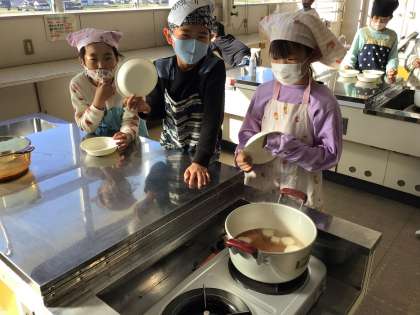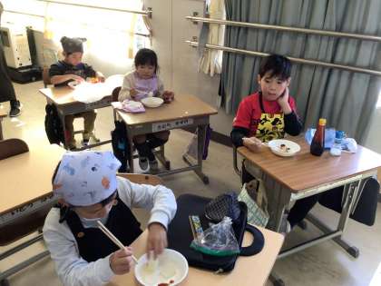 2年生が、生活科「大こんをそだてよう」の学習で、自分で育てた大根を収穫しました。収穫した大根は、自分で調理し、好きな調味料を付けて食べました。大切に育ててきた大根をおいしく食べることができ、とても満足した様子でした。