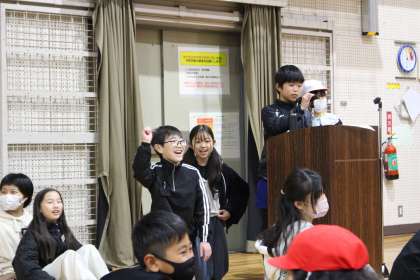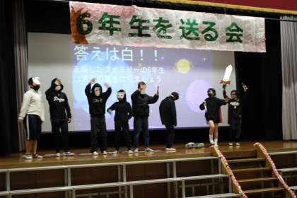 5年生が主催する6年生を送る会がありました。5年生は、6年生に感謝の気持ちを伝えるため、2月から準備を進めてきました。1年生から4年生も、6年生の似顔絵を描いたりプレゼントの鉢花を用意したりして、それぞれの役割を担いました。前日、5年生は体育館の飾りつけ、司会やクイズなど全体のリハーサル、ファミリー遊びの確認と、一人一人ができることを精一杯行っていました。本番がすばらしい会になり、6年生が喜んでくれたのは、目的をもって準備をしてきたおかげです。5年生のみなさん、ありがとうございました。