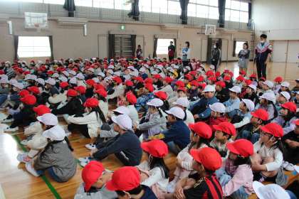 地震を想定した避難訓練がありました。10時に訓練放送が流れると、子どもたちが机の下に隠れる音が一斉に響きました。その後、子どもたちは担任引率のもと体育館に避難しました。どの子もとても真剣な表情で黙って避難ができました。