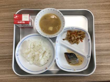 今日の給食は、さばの煮つけ、麦みそしる、筍ごはんの具です。混ぜご飯にしておいしくいただきました。