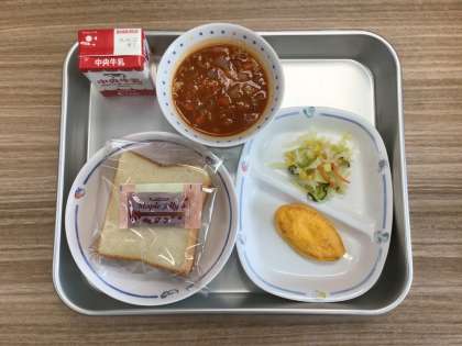 今日の給食は、ポークビーンズ、サワーキャベツ、オムレツ、スライスパンです。メープルジャムをつけておいしくいただきました。