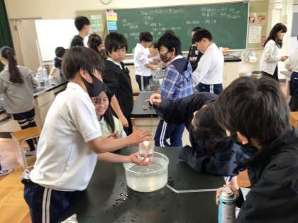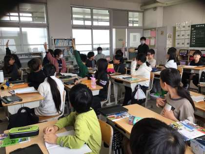 高学年では教科担任による授業が始まっています。5年生の社会科では、地球儀や地図を見て調べたいことを出し合っていました。「日本から一番遠い島を調べてみたい」「それぞれの国の形を調べたい」と相互指名で発言していました。6年生の理科では、燃えるために窒素・酸素・二酸化炭素のどの気体が必要かを実験しました。準備から片付けまで、グループで協力し合っていました。