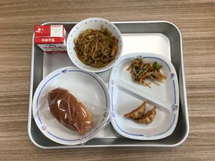 今日の給食は、焼きそば、米粉パン、愛知の食材入り揚げ餃子、ナムルです。今日もおいしくいただきました。