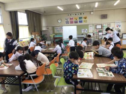 2年生が夏野菜を育てるための学習をしました。岡本さんから、どんな野菜が夏野菜なのかクイズを出してもらったり、2年生が育てるにはピーマン、オクラ、ミニトマトがよいと話をしてもらったりしました。その後、図書館の本を使って、育てたい夏野菜について調べました。「苦手だからピーマンを育てるよ」「土が乾いたら水をあげるんだね」と友達と言い合う姿が見られました。うまく育てられるとよいですね。