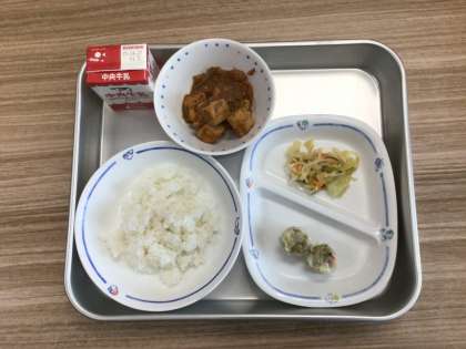 今日の給食は、ジャーチャン豆腐、中華サラダ、野菜入りシュウマイ、ごはんです。