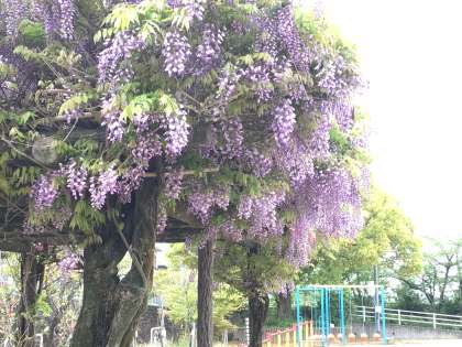 本校の藤棚の藤が見頃を迎えています。紫色の花に交じってピンク色の花も咲いています。垂れ下がった花房がかすかに風に揺れる姿はなんとも風情があります。蜂も寄ってくるため柵がしてありますが、授業参観等で本校にお越しの際には、ぜひご覧ください。