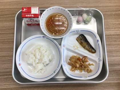 今日の給食は、花見献立です。かしわ汁、いわしの生姜煮、ちらしずしの具、ごはん、花見団子です。最近学校で出る花見団子には串が付いていません。お花見気分でおいしくいただきました。
