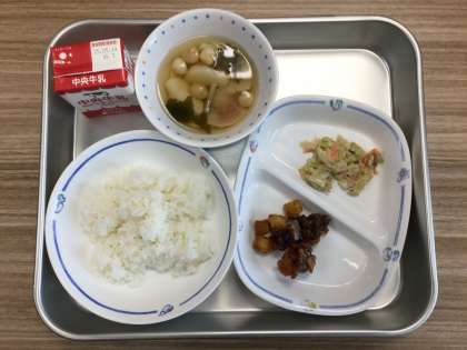 今日の給食は、たべまるのおすすめです。レバーとじゃがいもの甘煮、和風サラダ、麩玉汁、ごはんです。