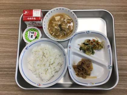 今日の給食は、豊田ブランドの日として、豊田ひまわりポークのしょうが炒め、アーモンドあえ、みそ汁、ごはん、抹茶水ようかんでした。