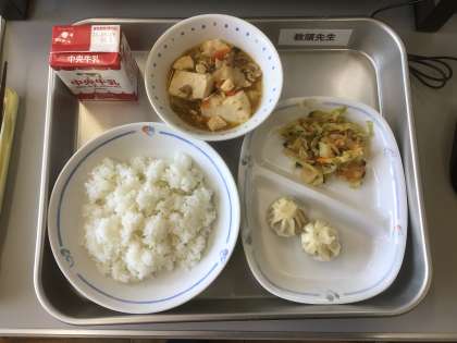 今日の給食は、豆腐の中華煮、バンサンスー、小籠包、ごはん、牛乳です。