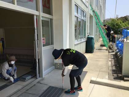 ボランティアグループのPLUS+さんが、夏日となって日差しの照り付ける中、子どもたちのために活動をしてくださいました。4年生が育てるゴーヤのネットの緩みを直してくださったり、昇降口のグレーチングを上げて砂を取ってくださったり、体育館の冷風機の掃除をしてくださったりしました。子どもや教員では手の回らない部分をいつも助けていただき、本当にありがたいです。これからもよろしくお願いします。
