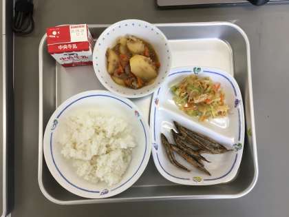今日の給食は、じゃがいものそぼろ煮、きびなごのからあげ、おひたし、ごはんです。