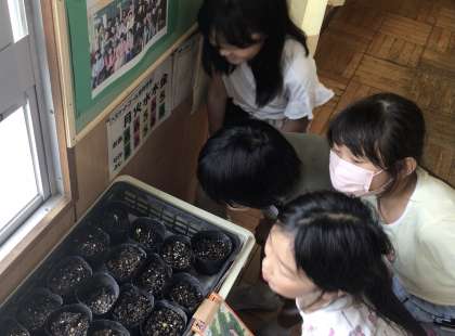 *5/21 たねまき子の観察日記4 ゴーヤの芽* 公開日 2025/05/21 更新日 2025/05/21 特色ある学校づくり推進事業 4年生は、環境教育の一環として、 ゴーヤで緑のカーテンを作り、 室内の温度が下がるか調べるそうです。 種から育てるのは、さすが若西っ子!! 教室で大切に育てています。