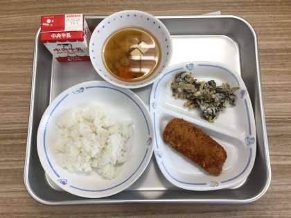 今日の給食は、いかフライのレモンしょうゆかけ、けんちん汁、骨太サラダ、ごはんです。