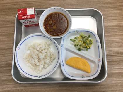 今日の給食はハヤシ、むぎごはん、チーズオムレツ、アスパラサラダです。ハヤシライスにして食べました。