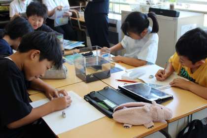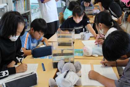 5日(木)に5年1組で理科の研究授業がありました。各班にメダカの水槽が渡され、メダカをじっくりと観察していました。「ヒレが違う!」とメダカの雌雄の違いに気付き、これからメダカについて知りたいことをみんなで話し合っていました。
