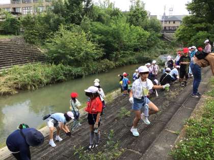 4年生が総合の「若西にこにこエコ大作戦」の学習で、逢妻男川の清掃活動を行いました。ゴミ拾いや草取りをすると、川岸も心もすっきりしました。今回の学習を生かして、地域の環境を守るために自分たちにできることを見つけていきます。