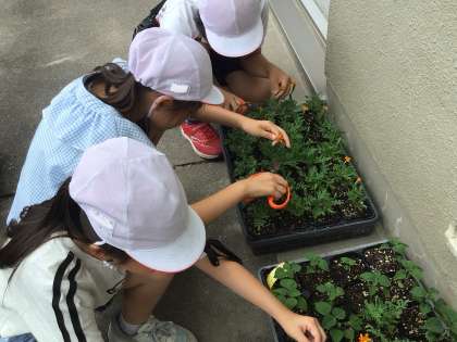 *6/25 たねまき子の観察日記13 摘心(てきしん)* 公開日 2025/06/25 更新日 2025/06/25 特色ある学校づくり推進事業 (上、中)今年は花苗の生長がよく、もうつぼみがつき、花も咲きはじめました。かわいそうだけど、つぼみやくきの先を切る「摘心」をしました。こうすることで、また新たな芽が出て、たくさんの花をつけることができます。 花壇の見頃の9月に、より多くの花を咲かせようと、手をかけています。 (下)4年生のゴーヤツルの長さが背の高さを越えました!