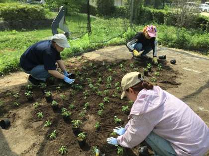 メイン花壇に日よけネットを設置しました。毎年、PTAのOBOGのみなさんが支柱を立て、ネットを張ってくださいます。このネットがあると、暑さから花苗が守られます。