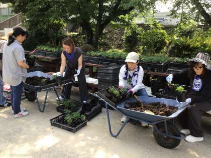 また、PTA園芸委員さんが、メイン花壇の一部や大きな黒ポットに花苗を植え替えてくださいました。暑い中でしたが、一生懸命行ってくださいました。