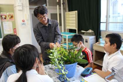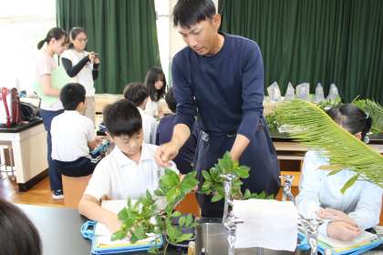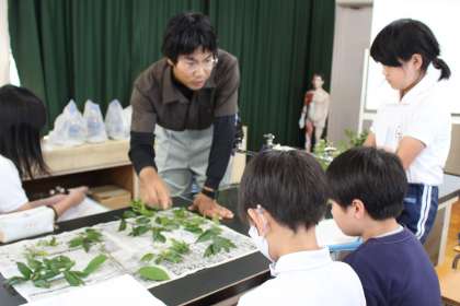 樹木の専門家たちは、学校にある樹木の種類を一目で見分けて葉や枝を採取し、実際に見せながら、色や形、手触りの違いを教えてくださいました。委員会の児童も教師も、樹木について深く学ぶことができました。