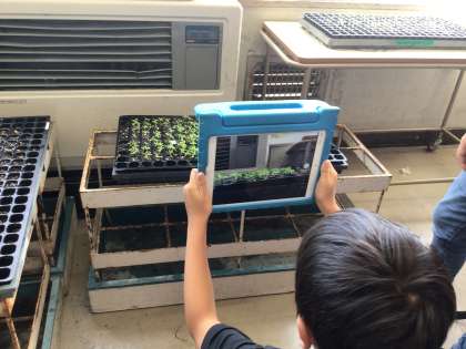 春に咲く花を調べ、育てたい花の種まきをしたり、新入生などにプレゼントする花を教室で育てたりしてます。また、学習用タブレットのteamsを使って、「花にっき」をつけて毎日みんなで生長を見守っています。きれいに咲かせようと自分たちでがんばる姿が花まるです!