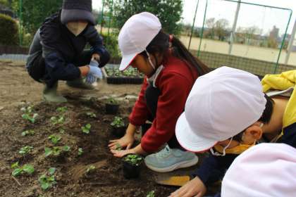*たねまき子の観察日記28 1、4年生の花壇定植 公開日 2025/12/10 更新日 2025/12/10 特色ある学校づくり推進事業 メイン花壇へのパンジー花苗植えの様子です。 1年生は鍵盤の「ミ」の音にあたる黄色のパンジー、4年生は「ファ」の部分の青色のパンジーを植えました。とても優しい手つきで花苗を植えていました!