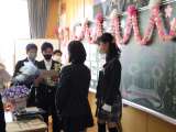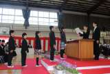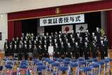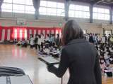校庭から図書館の窓を見あげると、桜の花の飾りと「卒業おめでとう!」の文字が! ...