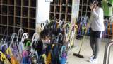 雨降りの朝、子ども達の傘が傘立てに集まります。傘を巻いて止めることがおぼつかなか...