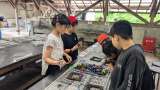 雨天なので、タライを使って魚を掴みます