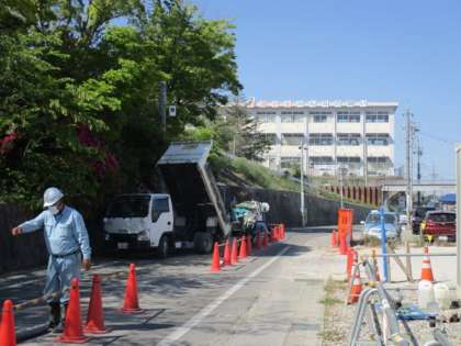 名鉄三河線高架化工事に伴い、本校周辺で工事が行われています。現在、坂道沿いの道路の工事を行っており、片側交互通行となっています。お車で本校に来校する際には、少し遠回りになりますが、歩道橋を通って校地へお入りください。道路の横断は危険ですのでご遠慮ください。