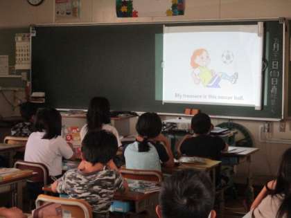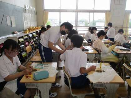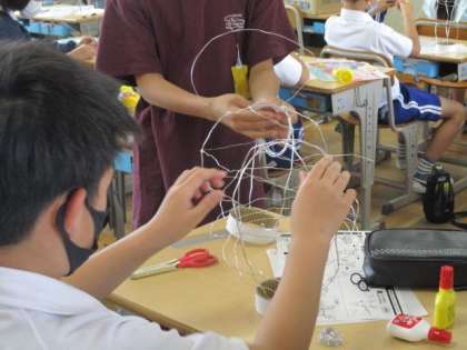 6年2組では針金を使ってランプシェードを作っていました。骨組みができたら和紙を貼るそうです。1組は英語の授業。みんな発音がよくて驚きました。